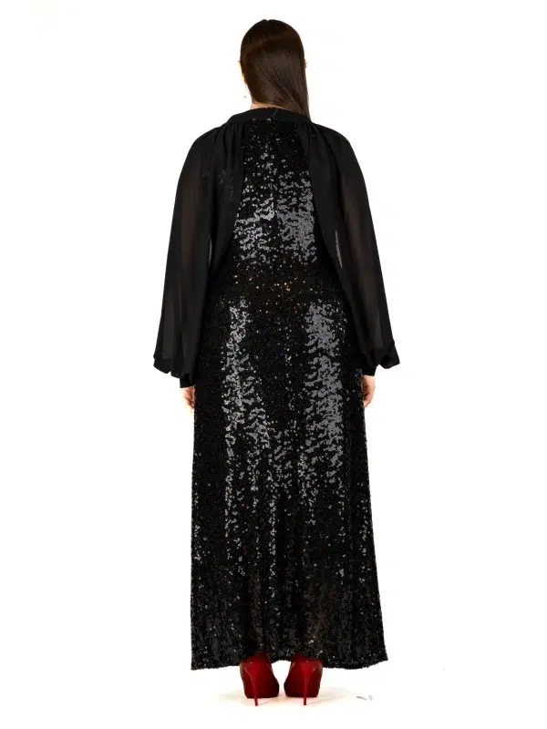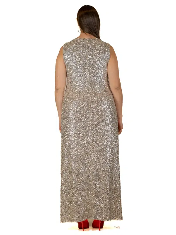 Cette robe longue à sequins séduit par son éclat raffiné et sa silhouette allongée